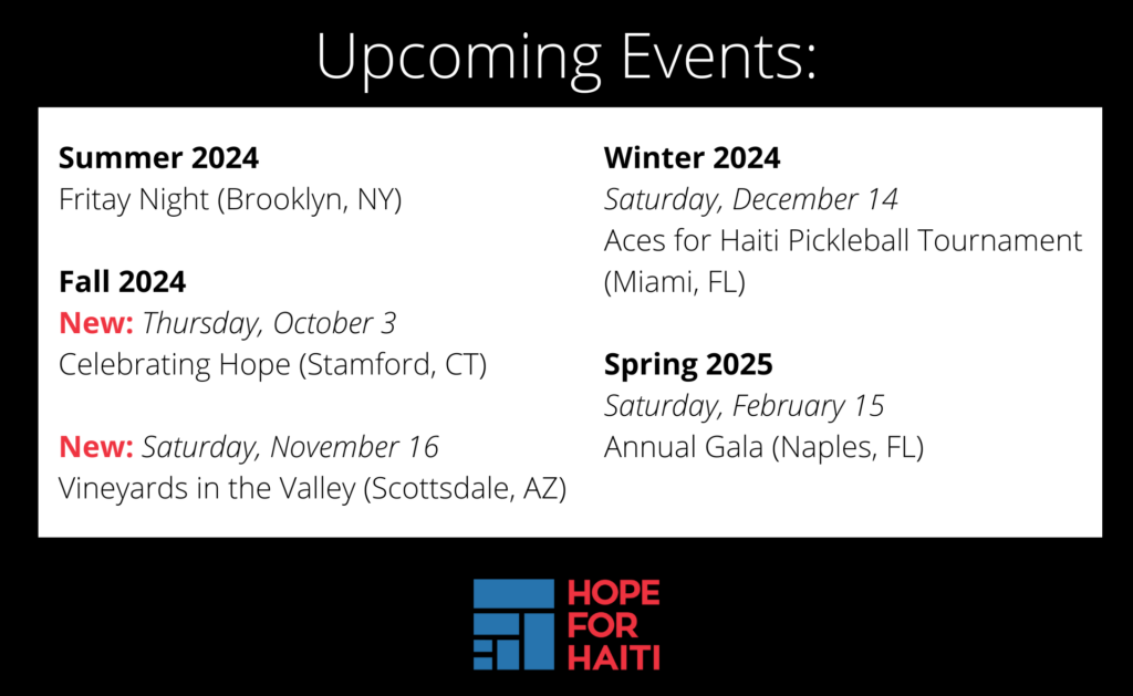 Join us at one of our upcoming events to support our programs and learn more about our work in rural southern Haiti! More details coming soon.