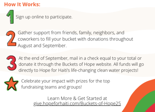 This August and September, join us for Buckets of Hope, a national fundraising campaign benefiting Hope for Haitiās WASH (Water, Sanitation & Hygiene) program.